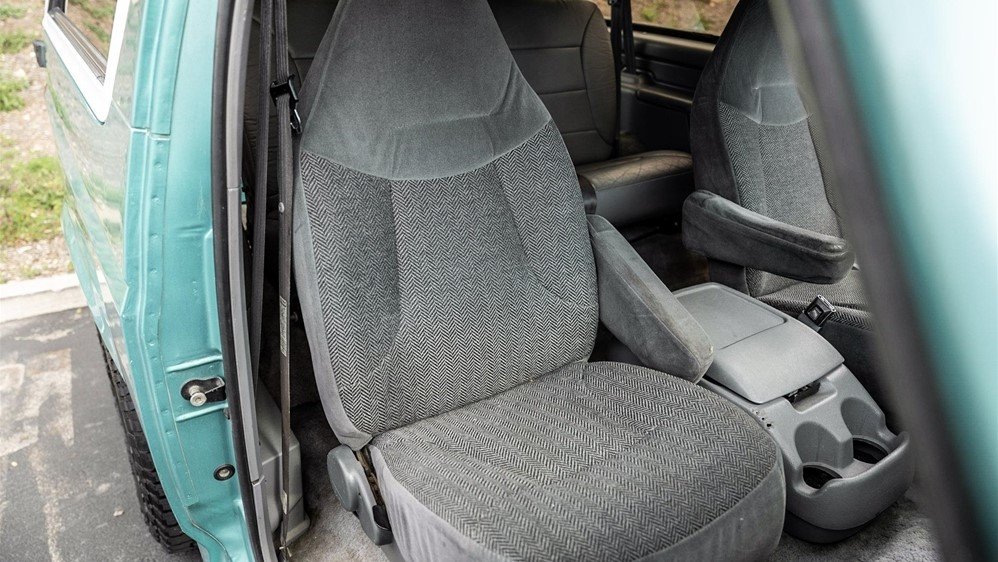 The upholstery is themed in Opal Gray cloth which covers the captain’s chairs up front and a bench in the rear. The remainder of the cabin has matching hues, and features include a JVC sound system, air conditioning, power windows, power door locks, a vanity mirror, and cruise control. There are a few noteworthy flaws including issues with the rear window and some upholstery blemishes.