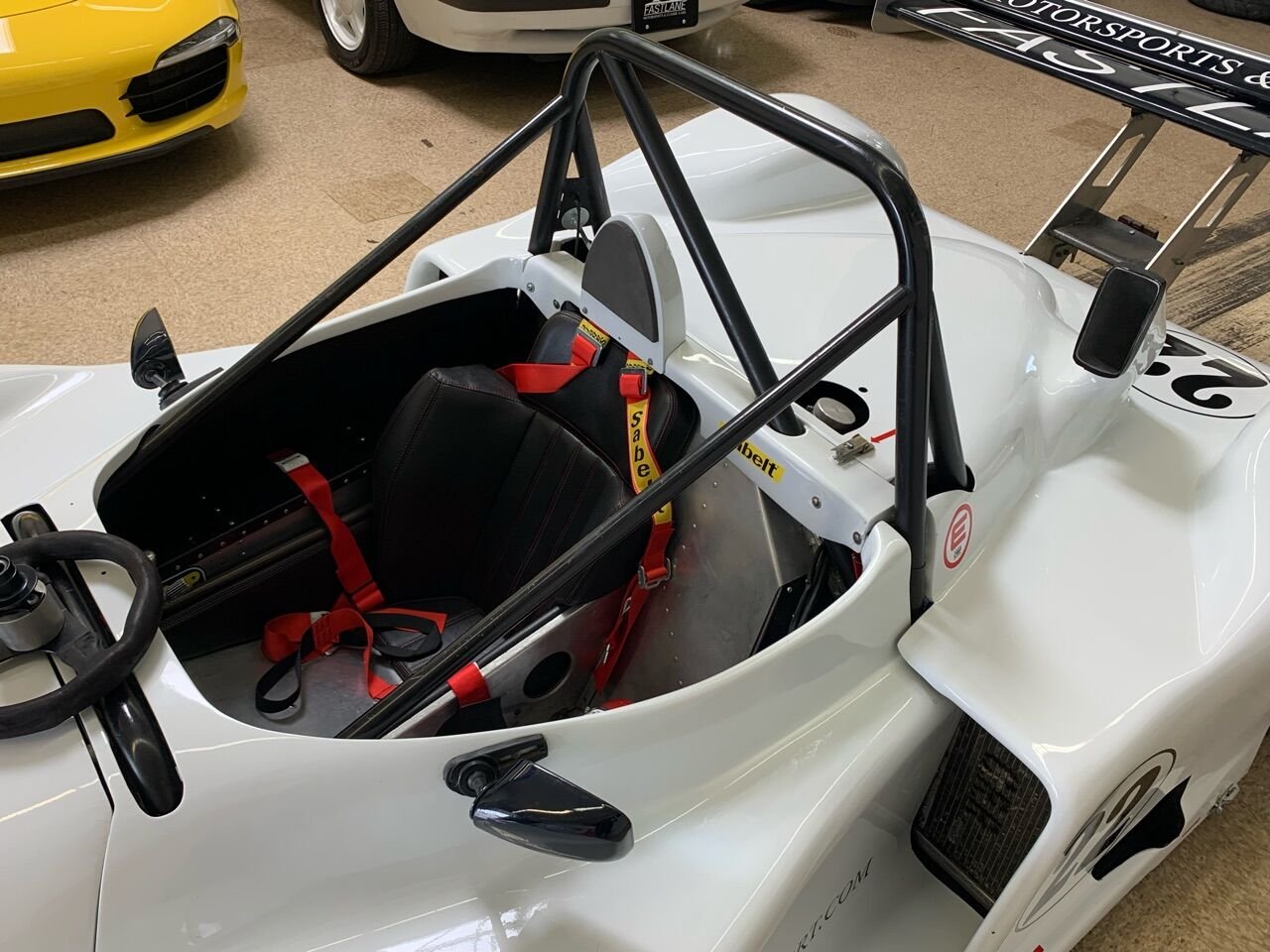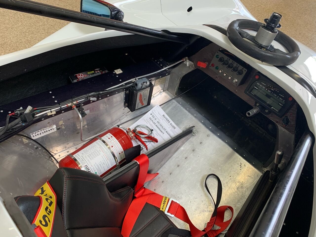 The single-seat cockpit is fitted with a black vinyl bucket seat with Sabelt Steel Series S6222 Formula 2×2 FIA harness. An OMP mechanical fire suppression system has been installed.