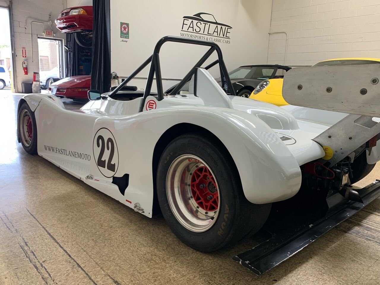 This one-off Merlin race car is chassis number 1 and was raced in Italy by Team Pomozzi. It features a white exterior with decals and sponsorship livery. Equipment includes dual black mirrors, side air intakes and rear wing.