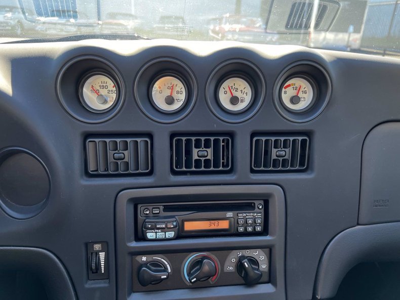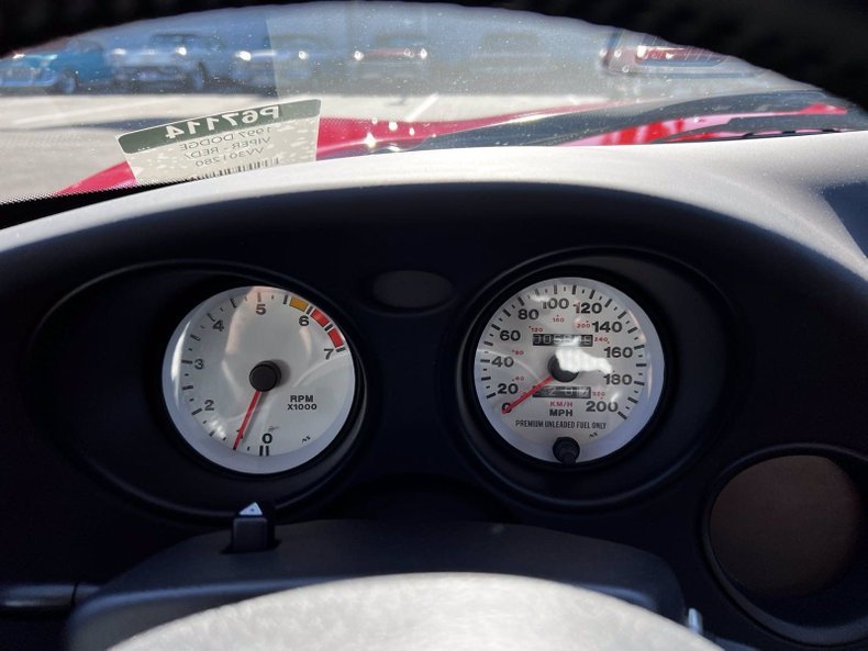 White-faced instrumentation includes a 200-mph speedometer, 7,000-rpm tachometer and auxiliary gauges showing fuel level, coolant temperature, oil pressure and voltage. The six-digit mechanical odometer reads about 6,000 miles, which is in line with the most recent CARFAX report.