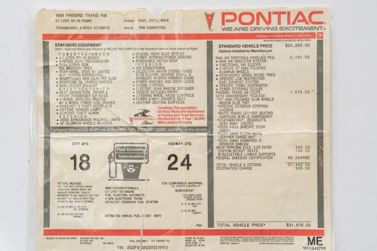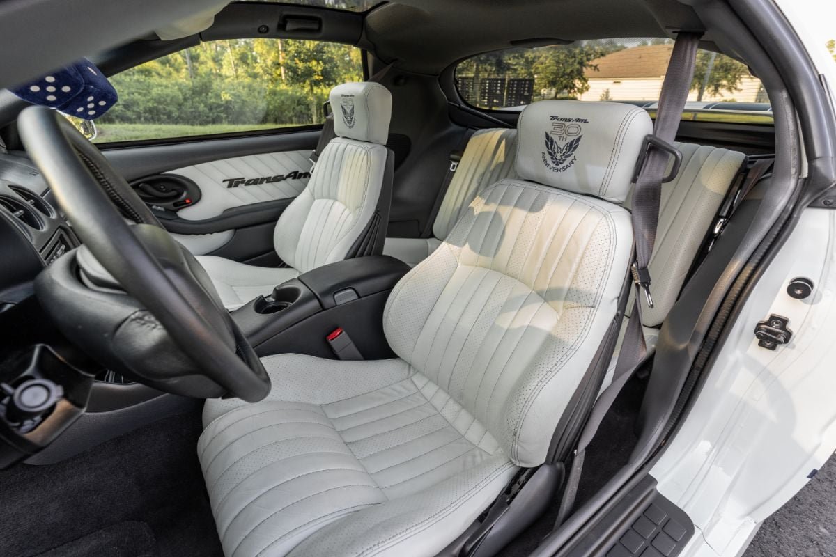 The front buckets and rear seat are upholstered in White Prado leather. Power options include driver’s seat, windows, locks, mirrors, and antenna. Additional features include air conditioning, tilt steering column, 500-watt Monsoon AM/FM/CD stereo with tweeters in the rear quarter panels (RPO W55), cruise control, rear window defroster, remote keyless entry, and center console with transmission shifter. The 30th Anniversary Edition package added white door inserts with “Trans Am” lettering, blue front headrest embroidery, a badge identifying this car as #724 of 1,600 made, and black floor mats with 30th Anniversary logos.
