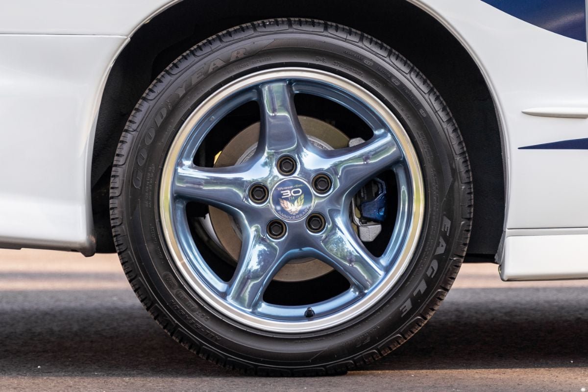 Thirty years before, the Trans Am debuted in the middle of the 1969 model year. Loosely based on the Firebird 400, the WS6 Trans Am package added the 335-horsepower 400 HO engine, ram air induction with special fiberglass hood, 3.55 Safe-T-Track rear, fender extractors, rear decklid airfoil, special steering wheel, Cameo White paint with Tyrol Blue stripes, and a few more options. It was the inspiration for the 30th Anniversary Edition, which included specific exterior and interior upgrades such as the paint and stripes, 17-inch blue-tinted wheels and numbered ID plaque.
