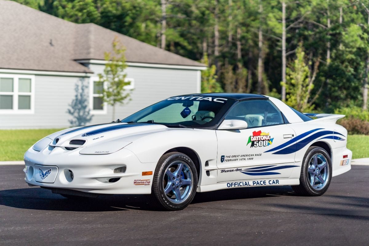 The exterior is wearing the factory-applied Arctic White paint, blue stripes, and both 30th Anniversary Edition and 1999 Daytona 500 Official Pace Car graphics. Features include Ram Air hood, tinted removable roof panels, power antenna, color-keyed mirrors, and rear spoiler.
