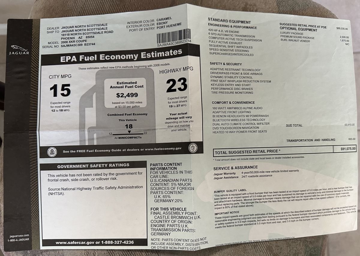 The 2+2 cabin is appointed with Caramel (code SEP) perforated leather bucket front seats (heated, no less) complemented by matching door panels, dash, center console, and carpeting. Befitting a prestigious British vehicle, this XKR features burl walnut veneer trim plus power windows, Adaptive Cruise Control with Forward Alert, keyless entry and start, speed-sensitive power steering, and dual-zone automatic climate control. Hopefully, you love leather, as the Luxury Package includes heated leather-wrapped steering wheel, leather-wrapped shift knob, adjustable seat bolsters, leather instrument panel, leather door panel inserts, and 16-way power-adjustability for the front seats. The Premium Sound Package contains a 525-watt Alpine Premium Dolby Pro Logic II surround sound system.