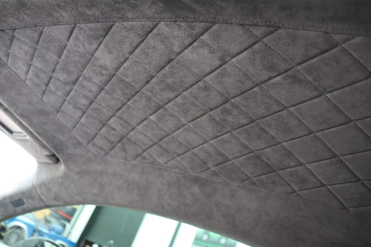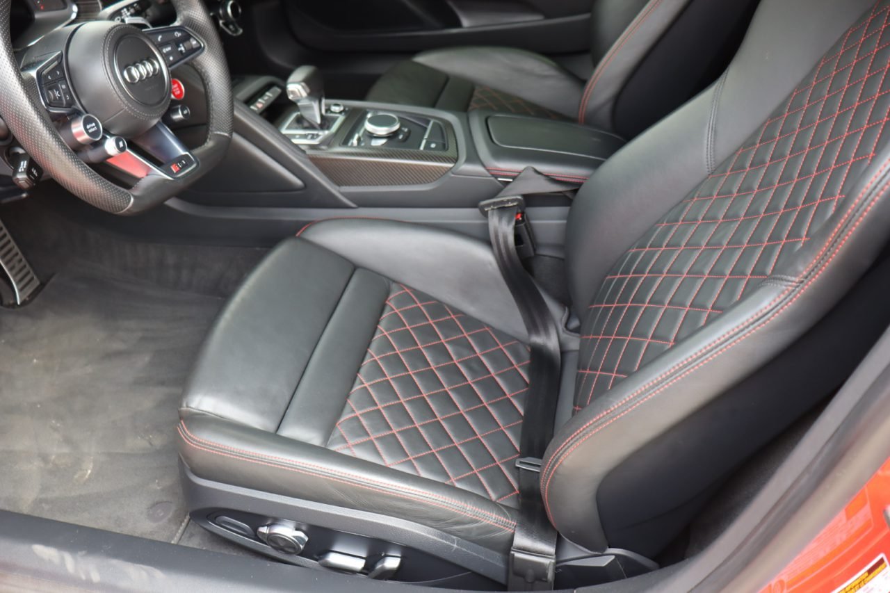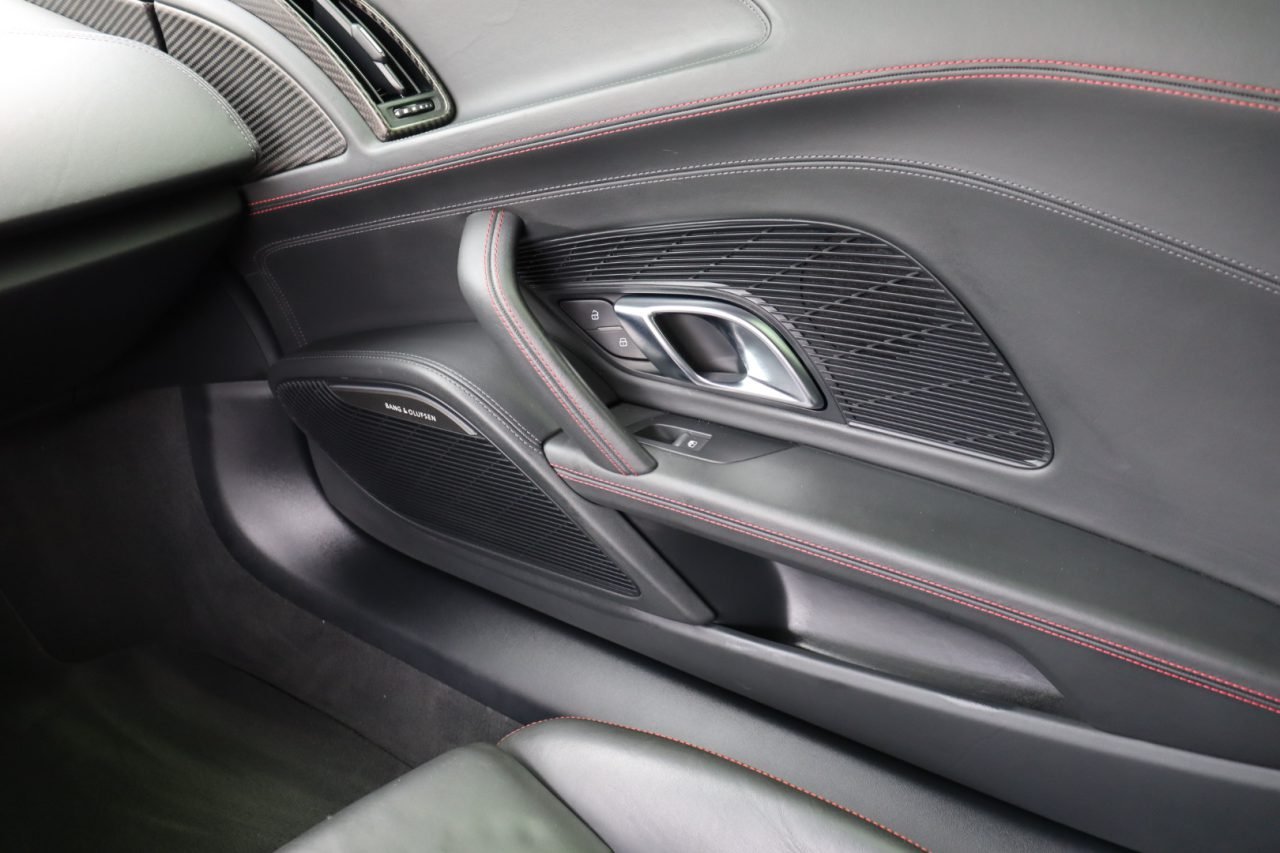 The cockpit is fitted with heated, 18-way power-adjustable black Fine Nappa leather bucket seats with diamond-stitched inserts. Glance above and you’ll find a similarly-stitched Alcantara headliner. The dashboard, instrument panel top, and door panels all feature Fine Nappa leather as part of the Full Leather package. Other interior items include carbon fiber trim, 13-speaker Bang & Olufsen audio system, MMI Navigation plus, LED door lighting, and other items that you’d expect on a vehicle of this caliber.