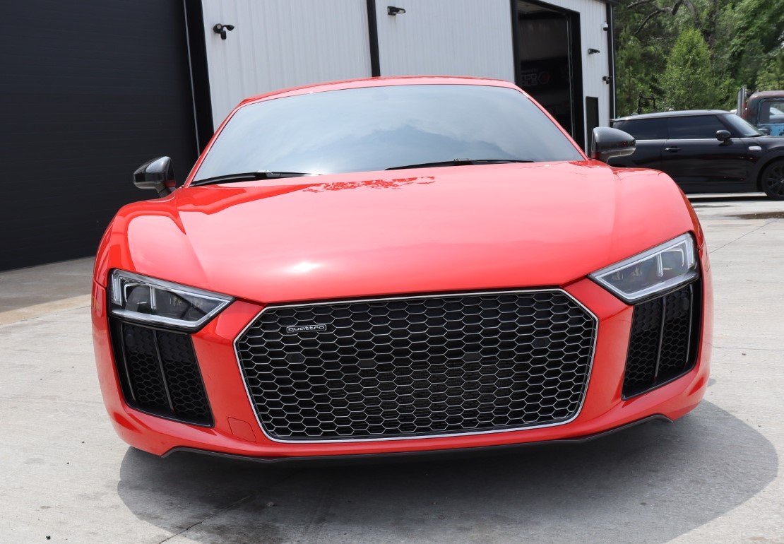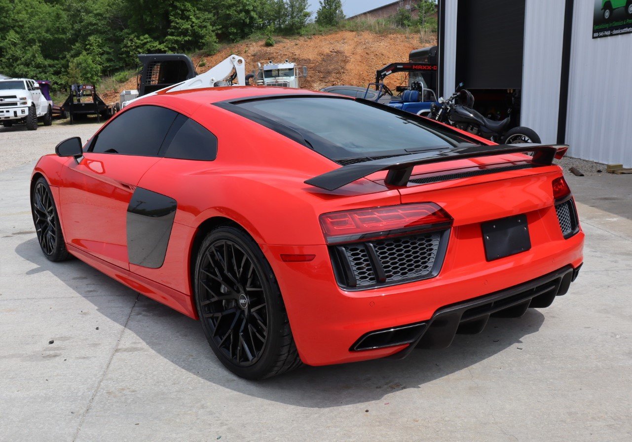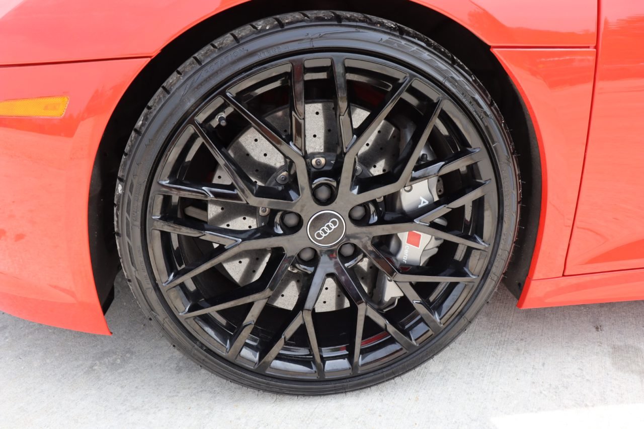 The Dynamite Red body features black-accented side blades, mirror caps, rear spoiler, and rear diffuser. Exterior features include LED headlights, daytime running lights, and taillights, Audi Beam puddle lights, mesh front and rear grilles, and dual black exhaust outlets. Ceramic coating was applied to the paint, wheels, and brake calipers in 2018.