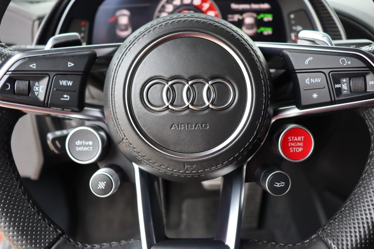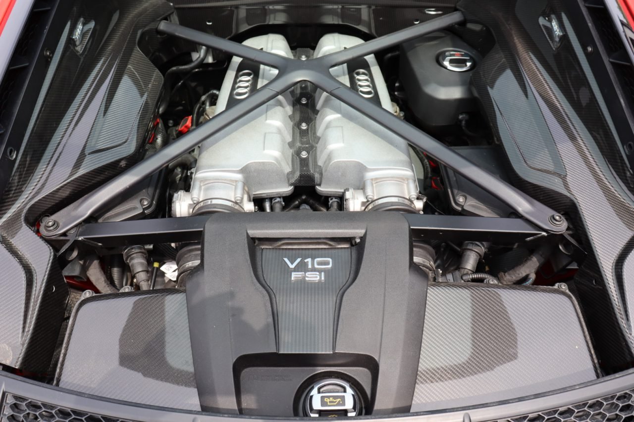 The mid-mounted 5.2-liter V10 offers a prodigious 610 horsepower and 413 lb-ft of torque. Power is sent to all four wheels via a console-shifted seven-speed S tronic dual-clutch automatic transmission and quattro all-wheel drive.