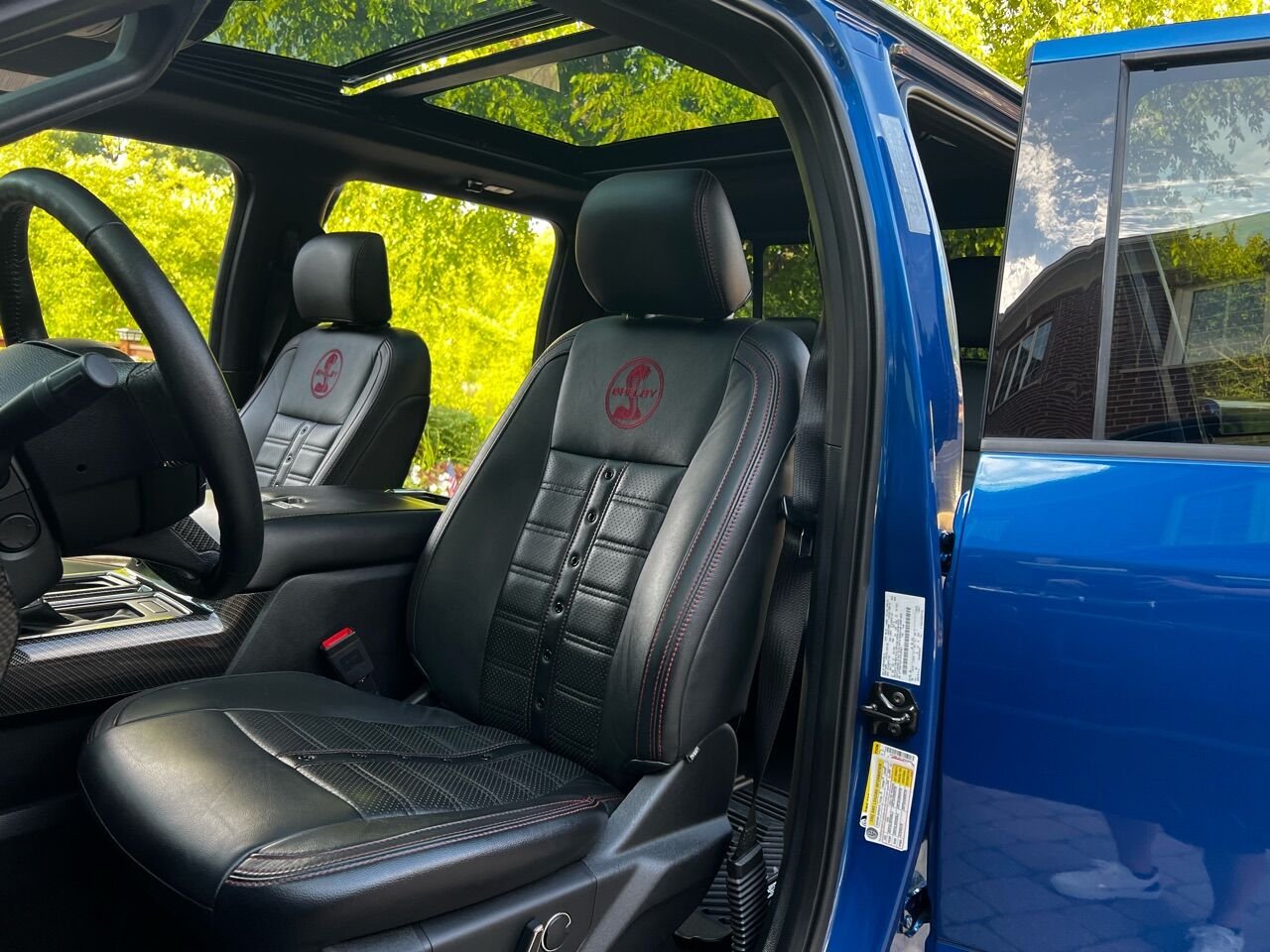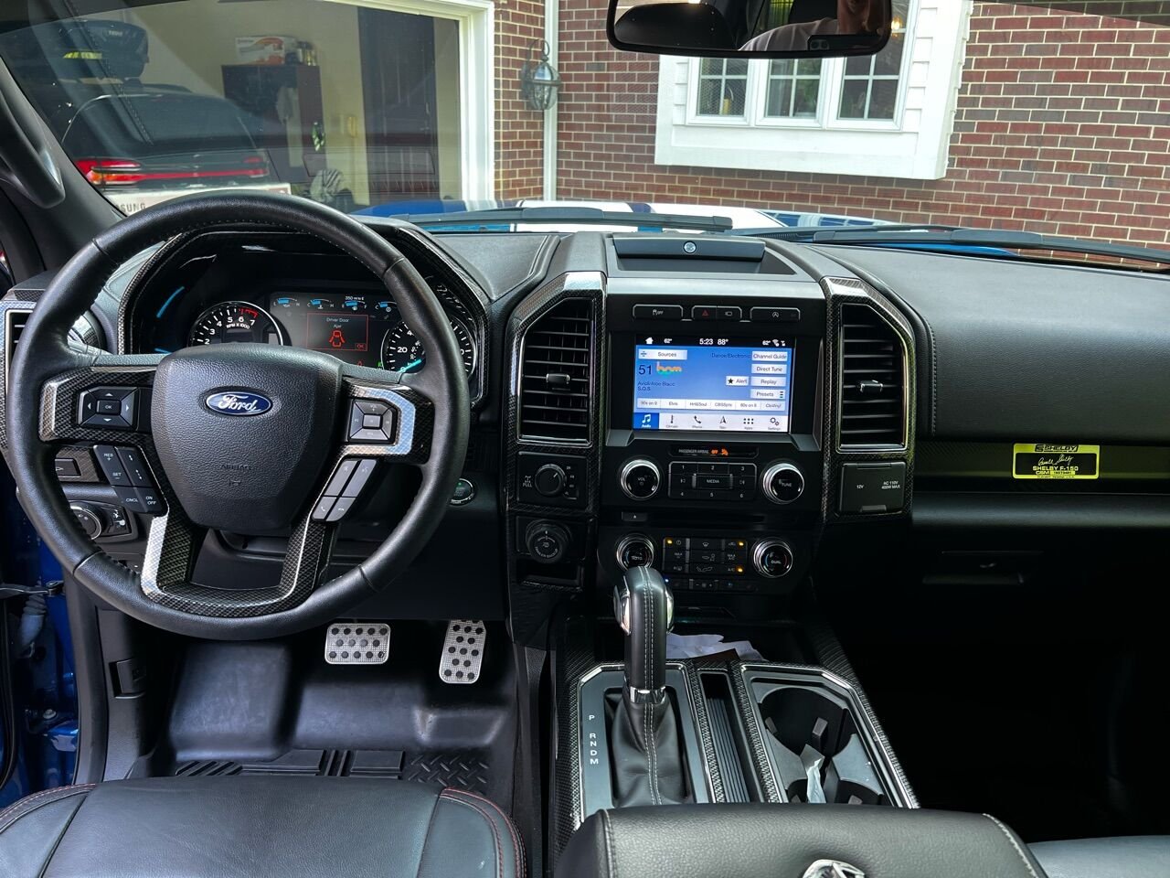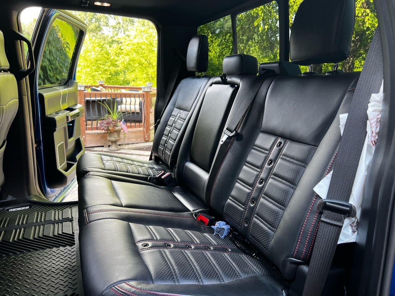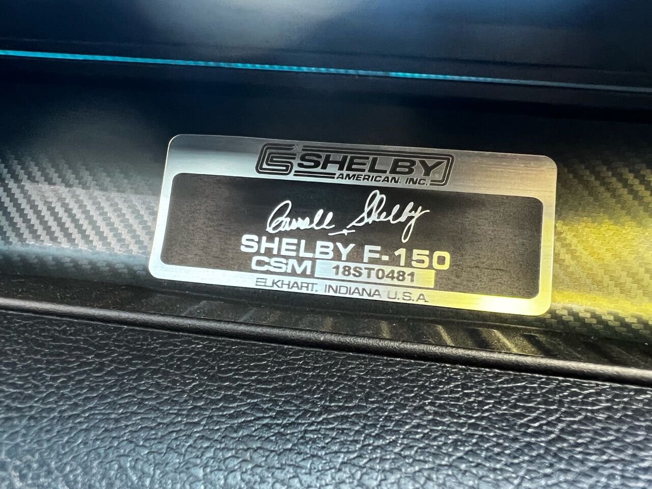 The cabin is fitted with black leather heated and ventilated power-adjustable front bucket seats up front and bench four three out back. Amenities include carbon fiber trim, embroidered Shelby insignias, adaptive cruise control, dual-zone automatic climate control, adjustable pedals, ambient lighting, Bang & Olufsen premium audio system, heated steering wheel, 360-degree camera system and more. An aluminum plaque from Shelby American identifies this pickup as CSM 18ST0481.