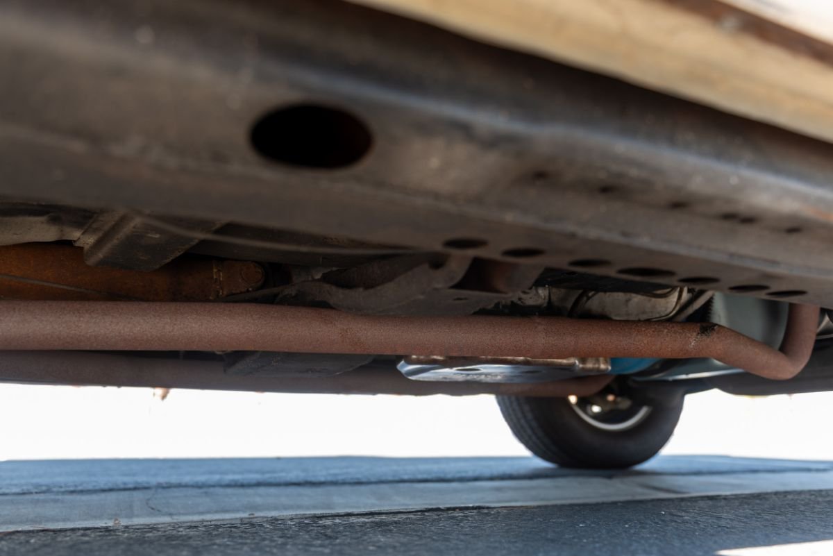 The front and rear seats are upholstered in black vinyl. Features include center console with Rally Sports Speed Shifter, tilt steering column, air conditioning (with new blower motor and HVAC controls), and RetroSound AM/FM/AUX radio that was installed in October 2022. The dashboard and center console were restored in 2022.