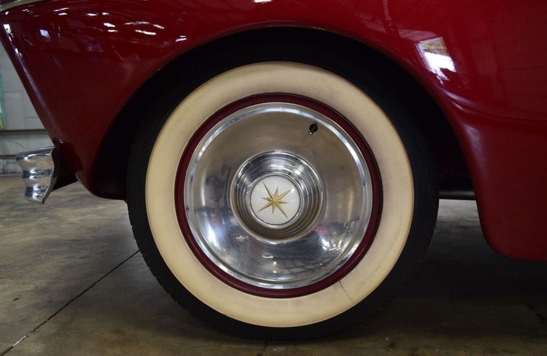 A set of red steel wheels with 1955 Lincoln front wheel covers is wrapped in whitewall radial tires.