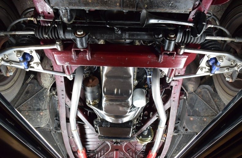 Underneath, this custom Mercury features a Fat Man Fabrications independent front suspension, power rack-and-pinion steering and 1960 Thunderbird nine-inch rear axle with 3.50 gears. Braking is provided by power front discs and rear drums. A dual exhaust system with glasspack mufflers exits at the rear. Additional photos of the undercarriage can be found in the carousel in the auction page.