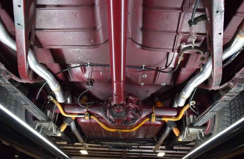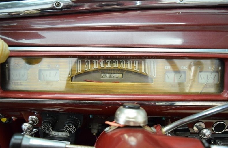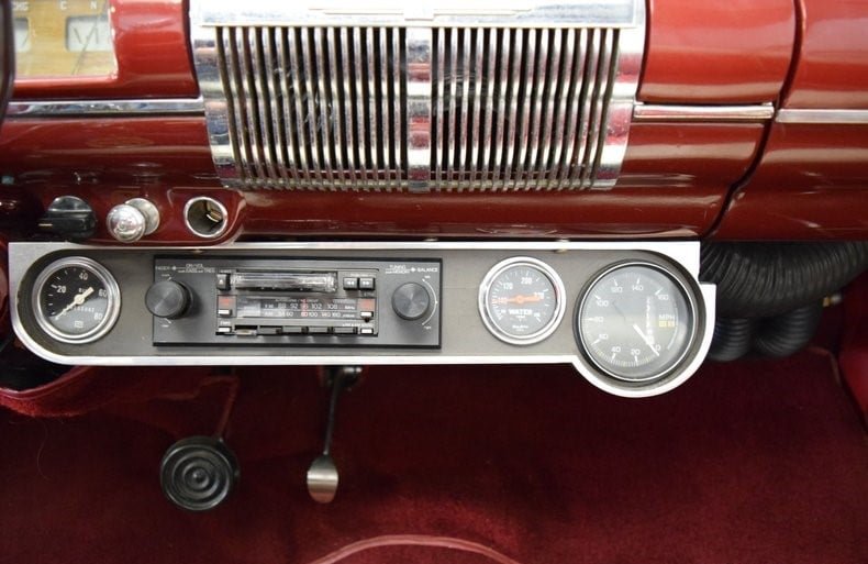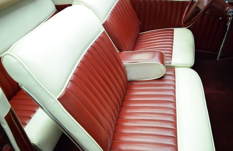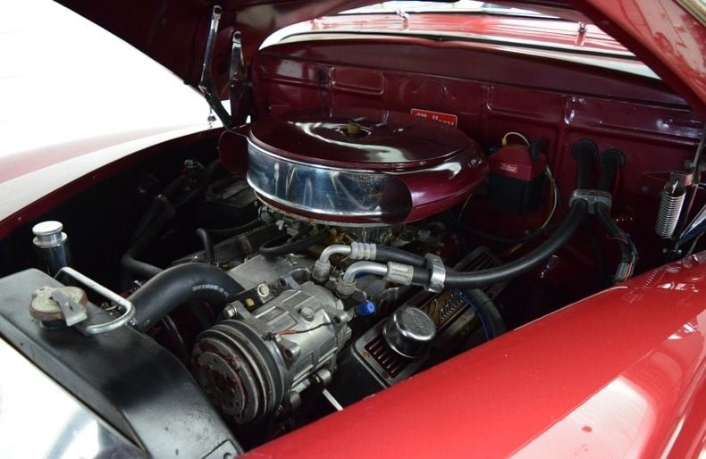 The power split front bench seat and the rest of the cockpit are upholstered in red and white pleated vinyl. Features include power windows and steering, tilt steering column, air conditioning, rear air shocks adjustment switch and column-shift automatic transmission.