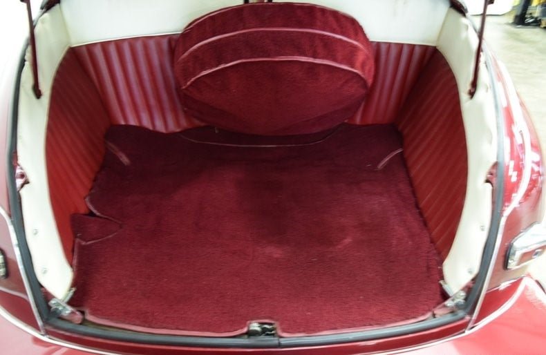 According to Don Miller, this car was customized in Ohio in 1959-1960 by Bax Brown. The exterior was refinished in Honduras Maroon over 30 years ago. Features include chopped windshield frame with a V-butt windshield, frenched headlights, shaved hood and trunklid, fender-mounted antenna, dual rearview mirrors and electric spotlights, folding tan convertible top and color-matched rear fender skirts.