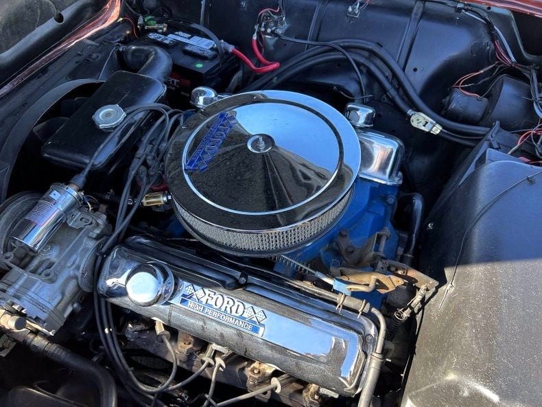 Power is provided by a 300-horsepower Thunderbird 352ci Special V8 backed by a three-speed automatic transmission. Engine bay features include chrome valve covers, air cleaner, and coil cover.