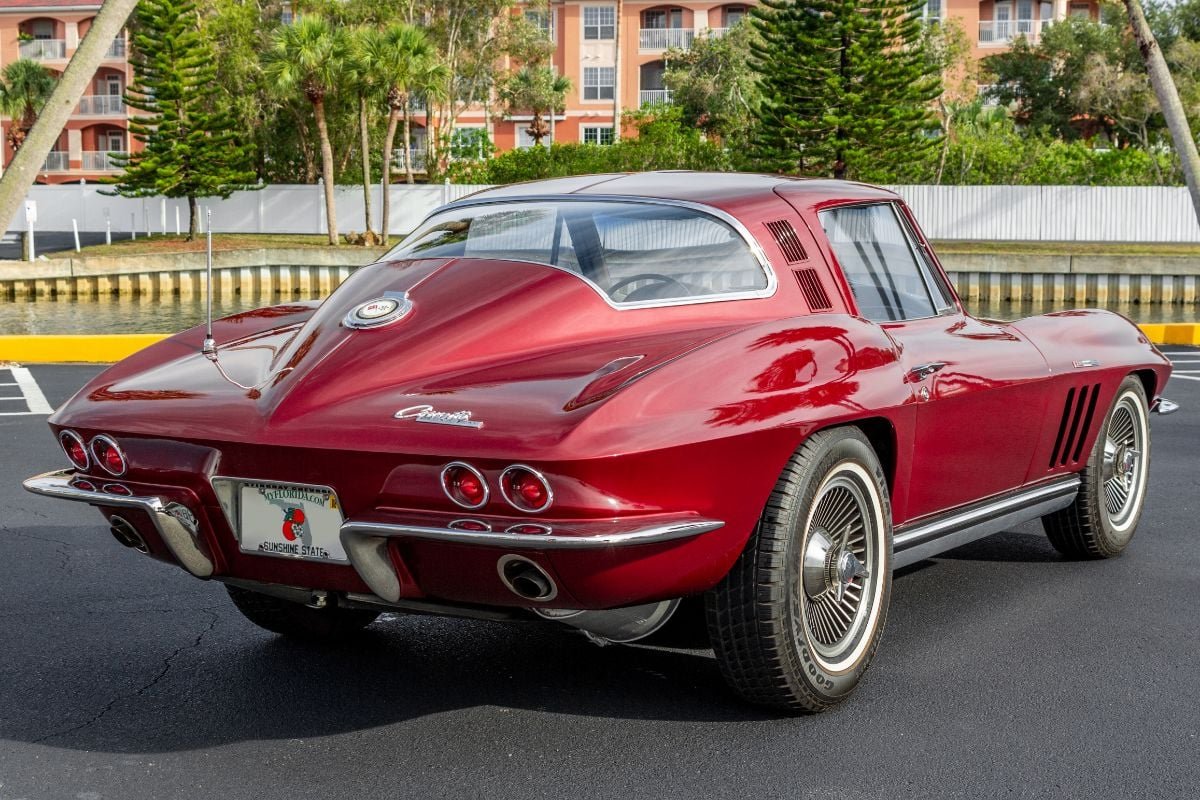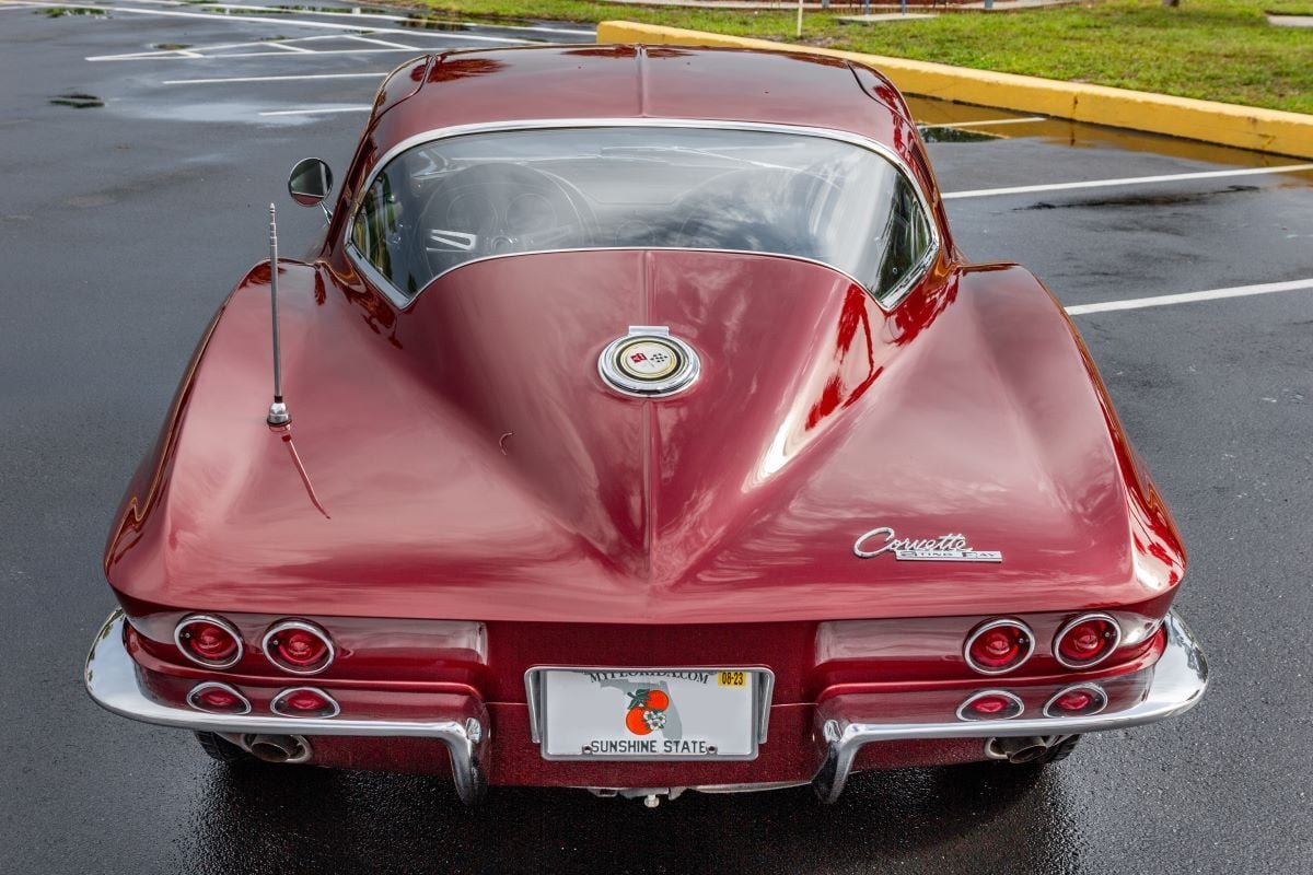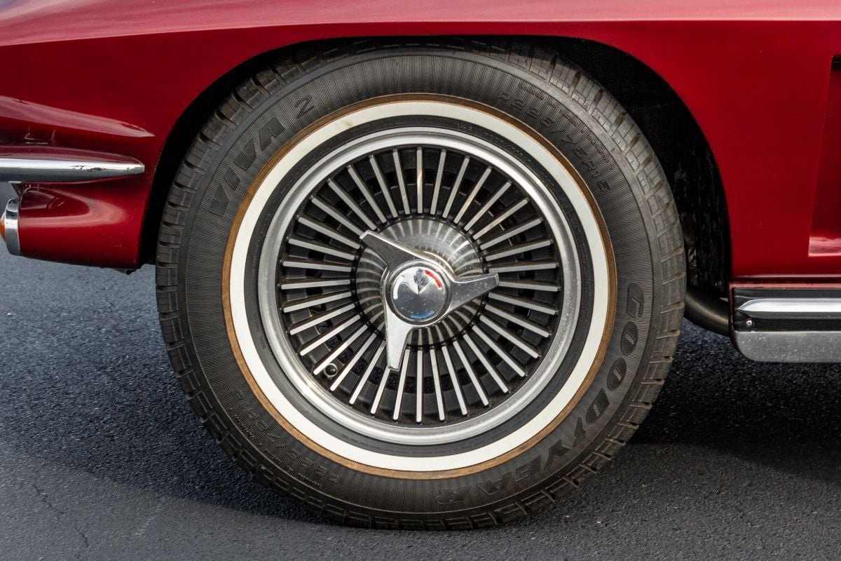 During the restoration, this Corvette was refinished in the original code MM Milano Maroon hue. Exterior features include driver-side mirror and power antenna.
