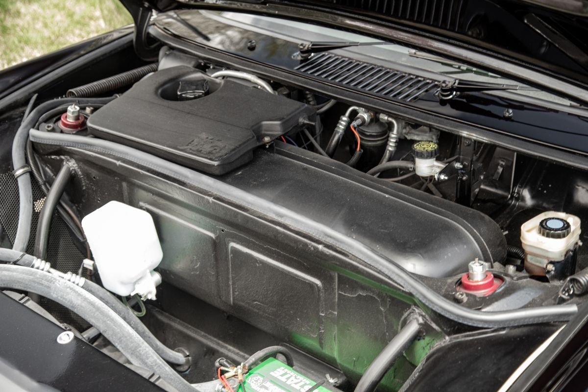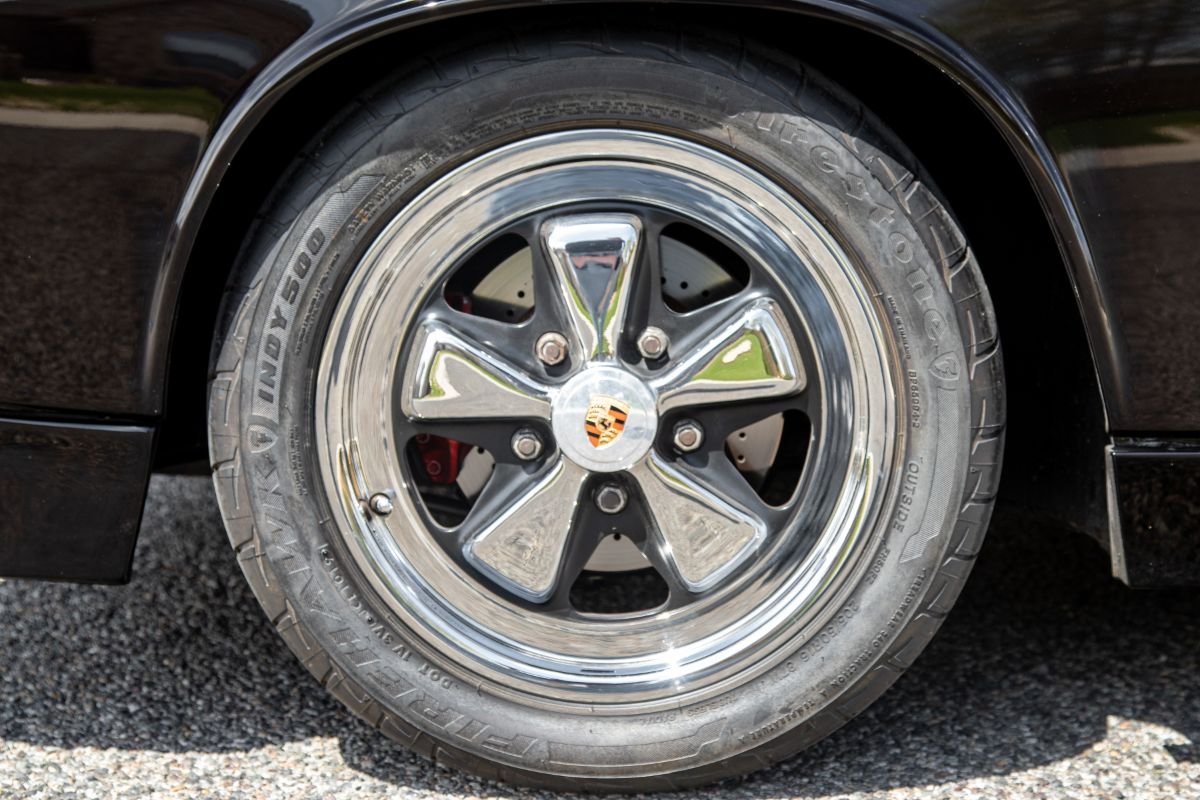 Over the past nine years, the exterior reportedly underwent a $25,000 refinishing that included a straightened body, rolled rear fenders and a bare-metal repaint in black. Added exterior features include chrome bumpers from a 1973 914, front and rear valances, custom rocker panels, dual mirrors, newer light lenses, and newer rubber moldings and trim.