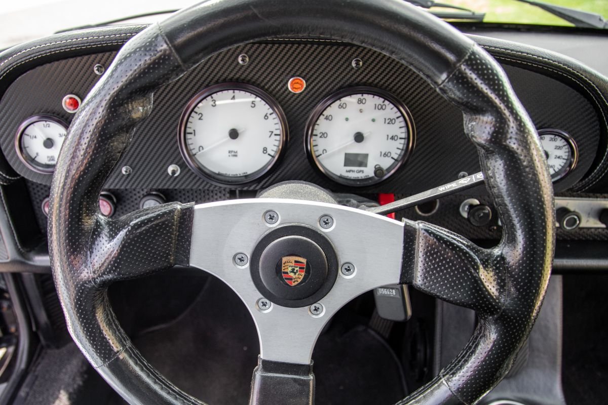 The two-seat cockpit is fitted with black cloth and vinyl buckets with matching door panels and carpeting. A 911-style instrument panel has been incorporated in the dashboard. Additional interior features include air conditioning, power windows and door locks, roll bar and JAZ Products four-point safety harnesses.