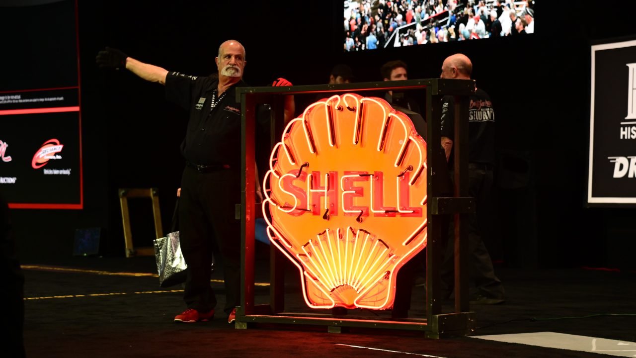 The star of the day’s Automobilia Auction was an impeccable Shell Oil neon porcelain sign (Lot #7298) from the 1930s, which sold for $69,000.