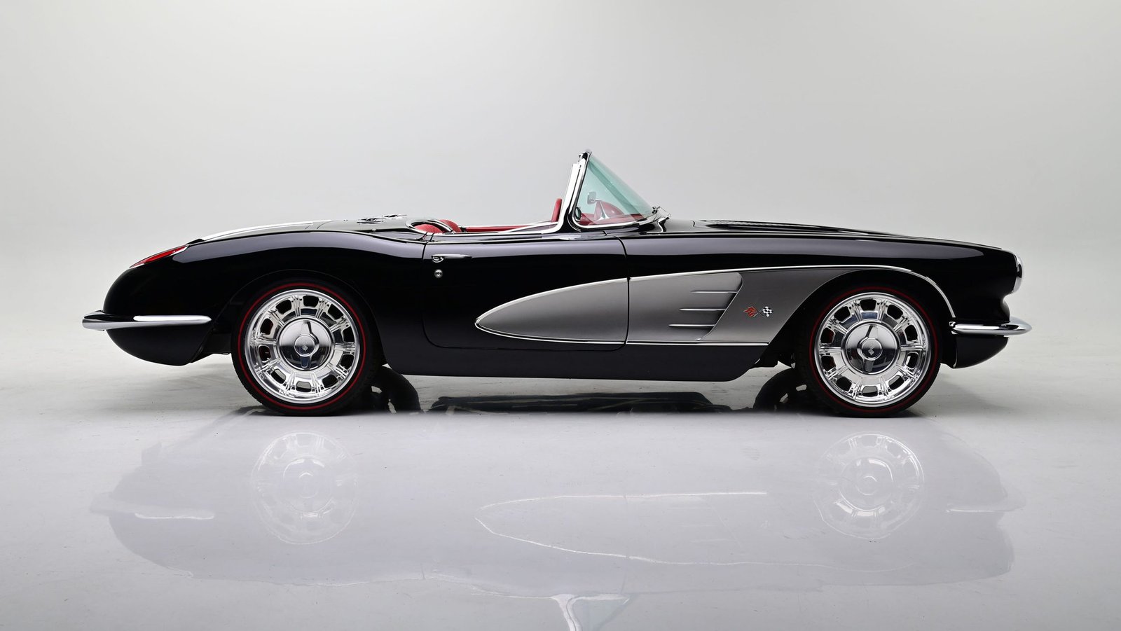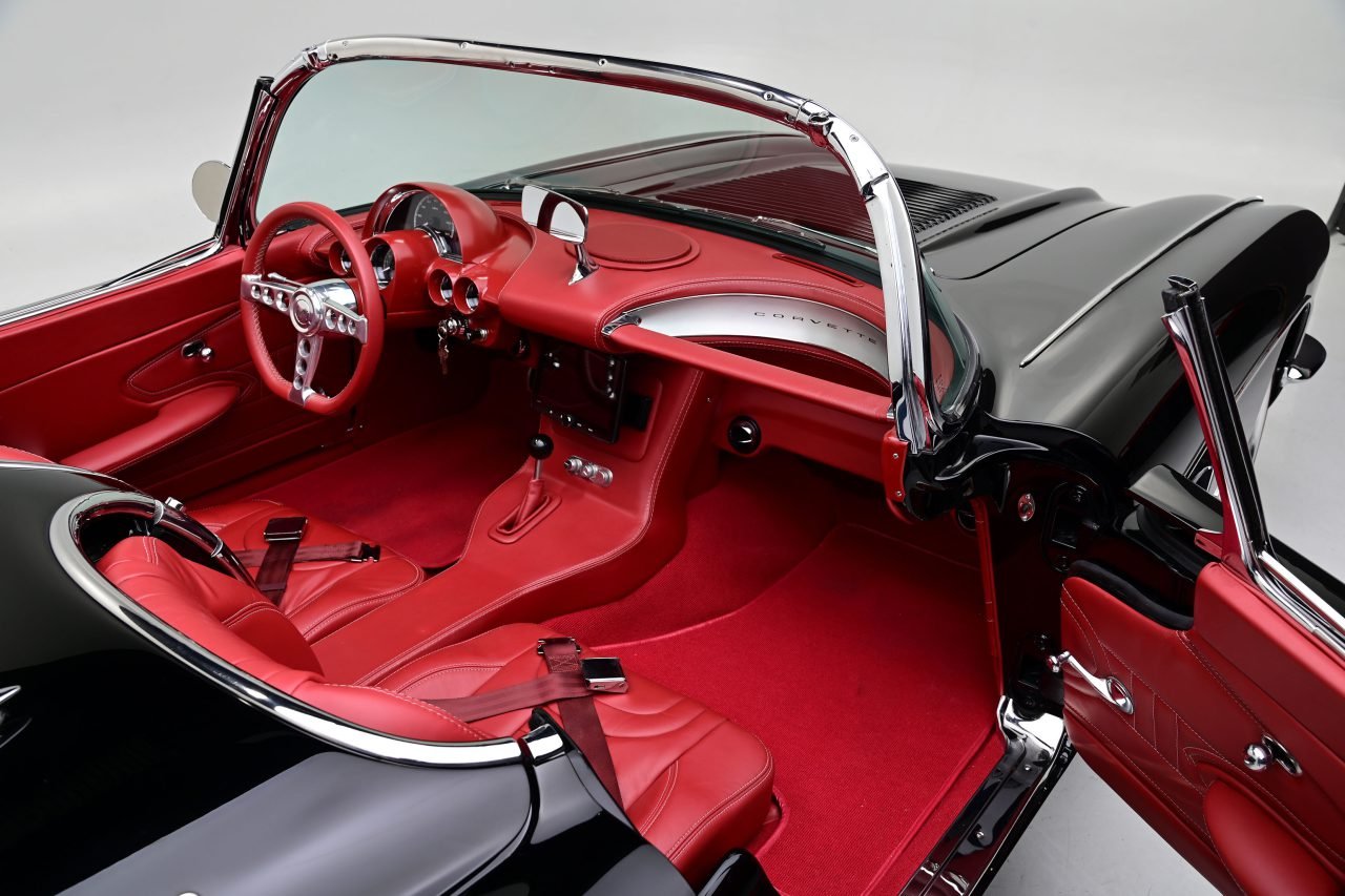 The black Resto-Mod 1958 Chevrolet Corvette was meticulously crafted and just completed in March of this year with only test miles driven on it. Powered by a new 6.2-liter LS3 V8 engine with a 4-speed automatic transmission, it rides on an Art Morrison IRS chassis with both independent front C7 and rear suspensions, fully adjustable RideTech coilovers and one-off custom wheels. The interior is complete with rich red leather featuring double stitching and concaved custom seats with a hand-stitched custom billet steering wheel.