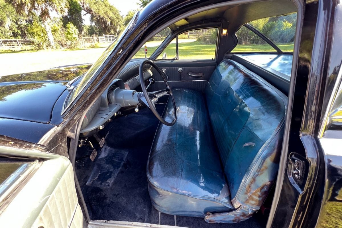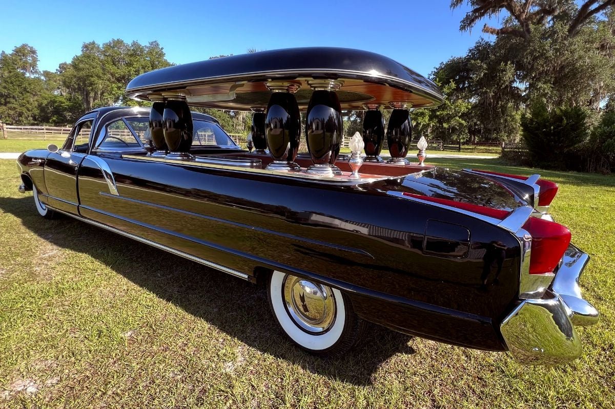 Among the IKA Carabelas built, few are as unique as this 1960 hearse. Featuring a 190-inch wheelbase and powered by 226cid straight-six paired to a three-speed manual on the column, the Kaiser-inspired funeral car features wrap-around back glass, rear fold-down gate and 89-inch sliding casket holder with rollers. The ornate casket cover with columns and working flame-illuminated casket lights add a special touch for the final ride.