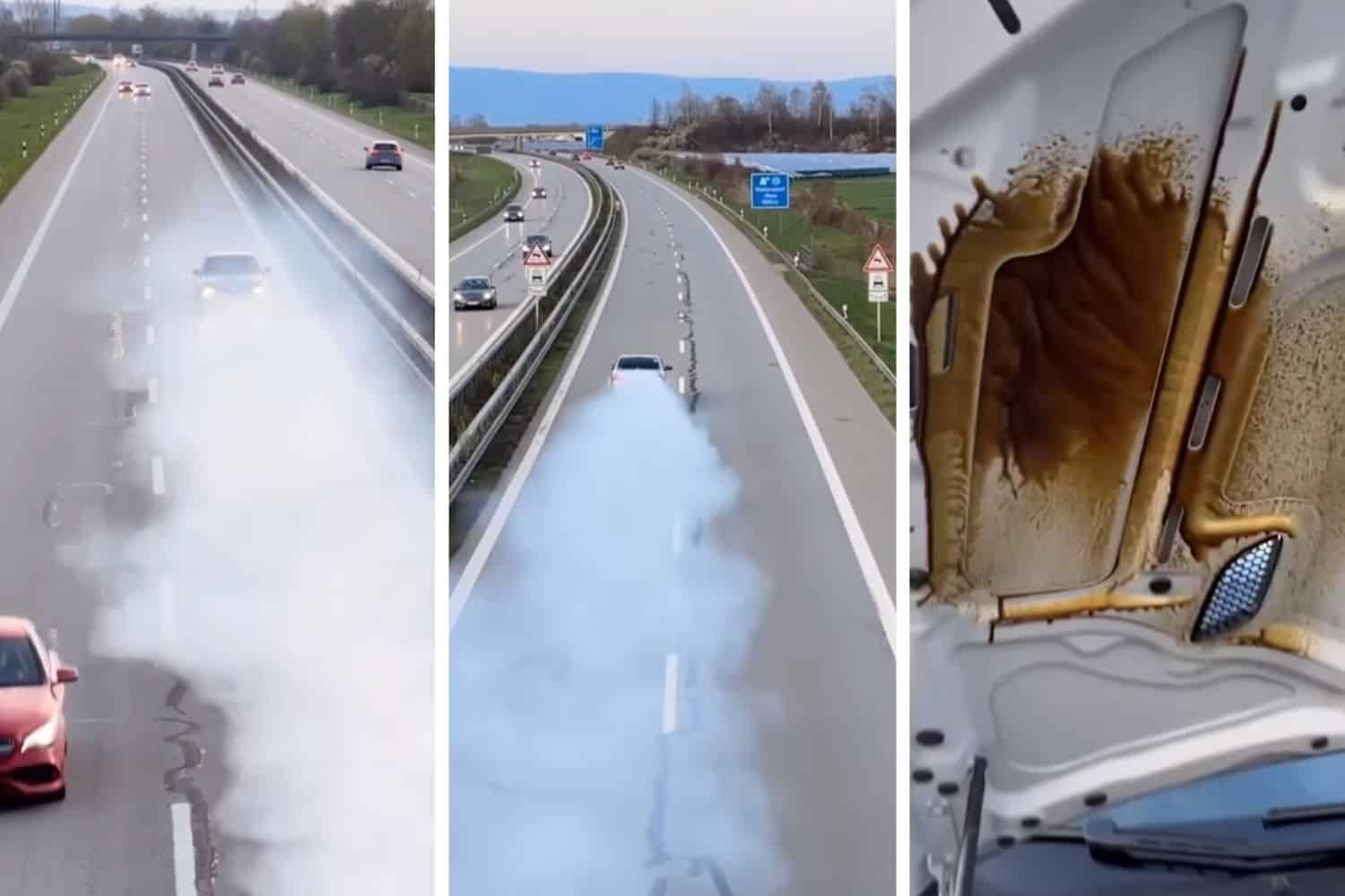 In a compilation video posted by Instagram user, bestofschaefchen, the silver M3 is seen speeding down the dual carriage-way, before its engine erupts into a cloud of a smoke as it passes underneath a bridge.