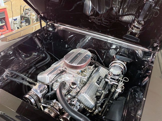 The ’58 Impala doesn’t require much modifications to make it appealing. With all the chrome and being a large car, black paint was the logical choice — Tuxedo Black Metallic plus a lot of clear and polishing. The silver painted center panels of the bumpers have been chrome plated. The grilled was finished in anodized chrome. The side and back glass is gray tinted. The rocker moldings have been powder coated black minus the top quarter inch. The 17-inch chrome wheels give the Chevy a modern stance.
