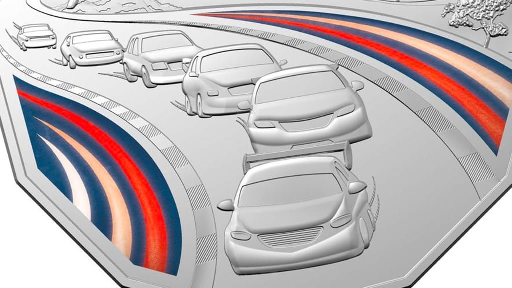 The front of the coin depicts six race cars (we think these represent an HK Monaro, XA Falcon, VK Commodore, AU Falcon, VE Commodore and a Ford Mustang) as well as a coloured strip on either side of the track.