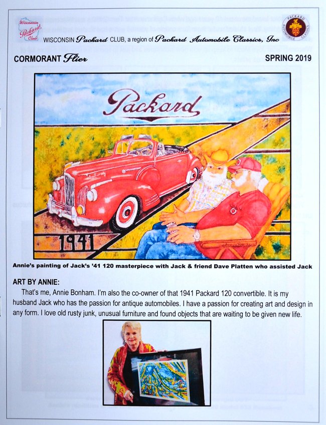Maybe you have a knack for finding nice, old cars. Maybe your skill is to restore them. Maybe you have other gifts, too, such as an artistic bent. If you do, you may appreciate Annie Bonham of the Wisconsin Packard Club, a region of Packard Automobile Classics, Inc. Her ability surfaced in the Spring 2019 edition of Cormorant Flier, W5867 Lake Drive, Shawano, WI, 54166 (www.facebook.com/WisconsinPackardClub).