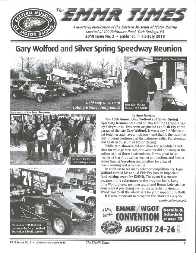 The Eastern Museum of Motor Racing is dedicated to promoting the history of race cars while helping collectors enjoy a taste of that sport behind the wheel of a once-active car. Information about the organization can be found in The EMMR Times, P.O. Box 688, Mechanicsburg, PA, 17055-0688 (www.EMMR.org). The museum is located at 100 Baltimore Road, York Springs. Lynn Paxton is curator.