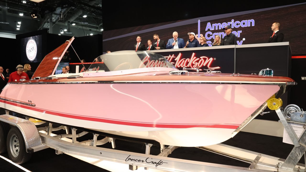 Barrett-Jackson brought a wave of excitement to the stage with a remarkable charity auction on Friday, featuring the VIN 001 2024 Lancer Craft Elite Runabout Boat. Generous winning bidder Dave Maxwell will be taking the 20-foot boat home with 100 percent of the $110,000 hammer price going to the American Cancer Society. Longtime Barrett-Jackson friends Mike and Tracy Patterson donated an additional $50,000 to the cause, which was followed by a $5,000 donation on the arena floor – bringing the total raised to $165,000.