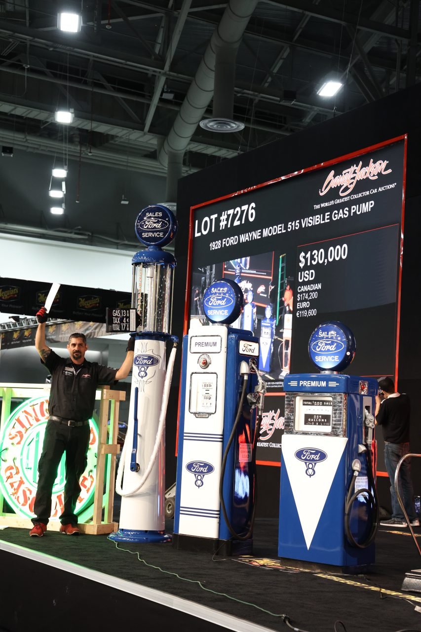 Friday morning’s Automobilia Auction featured many rare and unique collectibles, transporting enthusiasts to an era when classic cars ruled the streets. Gas pumps continued to captivate buyers, with notable sales that included a spectacular 1928 Ford Wayne Model 515 visible gas pump (Lot #7276) that sold for $149,500 – setting a new auction world record – while a late 1950s-early ’60s Ford Wayne 505 gas pump (Lot #7278) and a 1940s-50s Ford Wayne #70 dealership gas pump (Lot #7281) each sold for $34,500. Neon also captivated bidders, with a large 1950s Chevrolet OK Used Cars porcelain sign with neon (Lot #7299) that sold for $24,150, followed by a large 1930 Shell Oil porcelain with neon sign (Lot #7298.1) that went to its new home for $23,000.