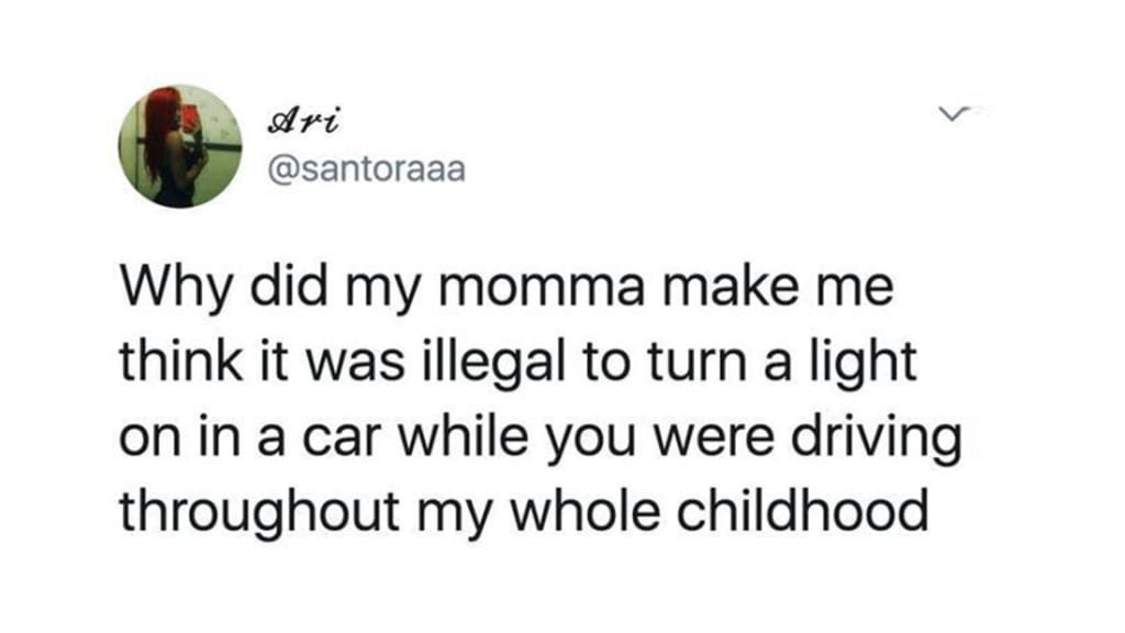 Another much-circulated meme jokes: “Why did my momma make me think it was illegal to turn a light on in. a car while you were driving throughout my whole childhood?”