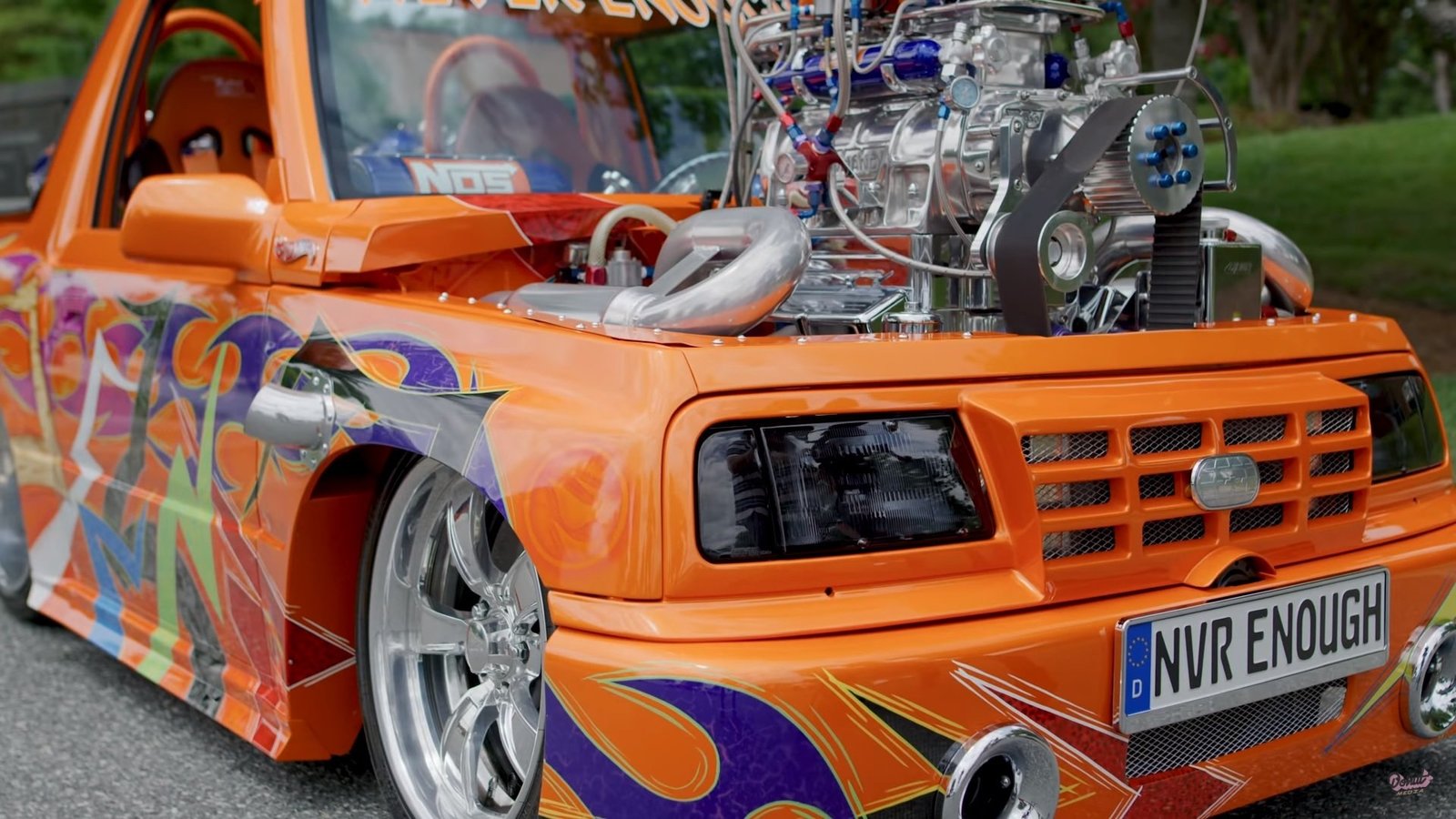 One look at this thing will reveal exactly what we mean by “full-blown.” Sitting under that enormous nitrous-fed supercharged V-8 is a Chevrolet Geo Tracker, which now, after an enormous amount of work, looks every bit the part of a Hot Wheels toy. The paint is a crazy shade of orange mixed and matched with some wild graphic overlays, while nitrous bottles dot the exterior and interior alike. There’s even a wind up key in back.