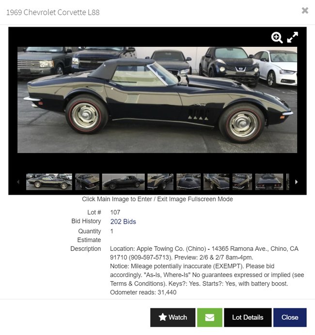 This vintage 1969 Chevrolet Corvette L88 was a treasure we discovered in the Collector / Antique Autos category on HiBid.com. At the time this screenshot was taken, the car had been bid up beyond $230,000 with nearly a week to go.