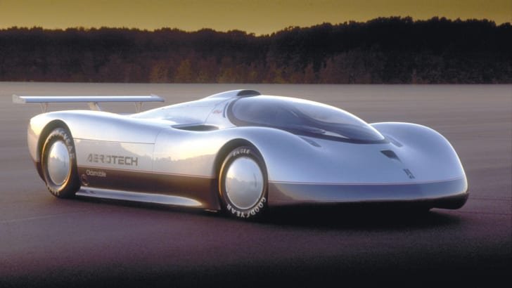 With four wheels and a low-aero signature, the AirCar looks similar to the Oldsmobile Aerotech concept car (above) of the mid-1980s.