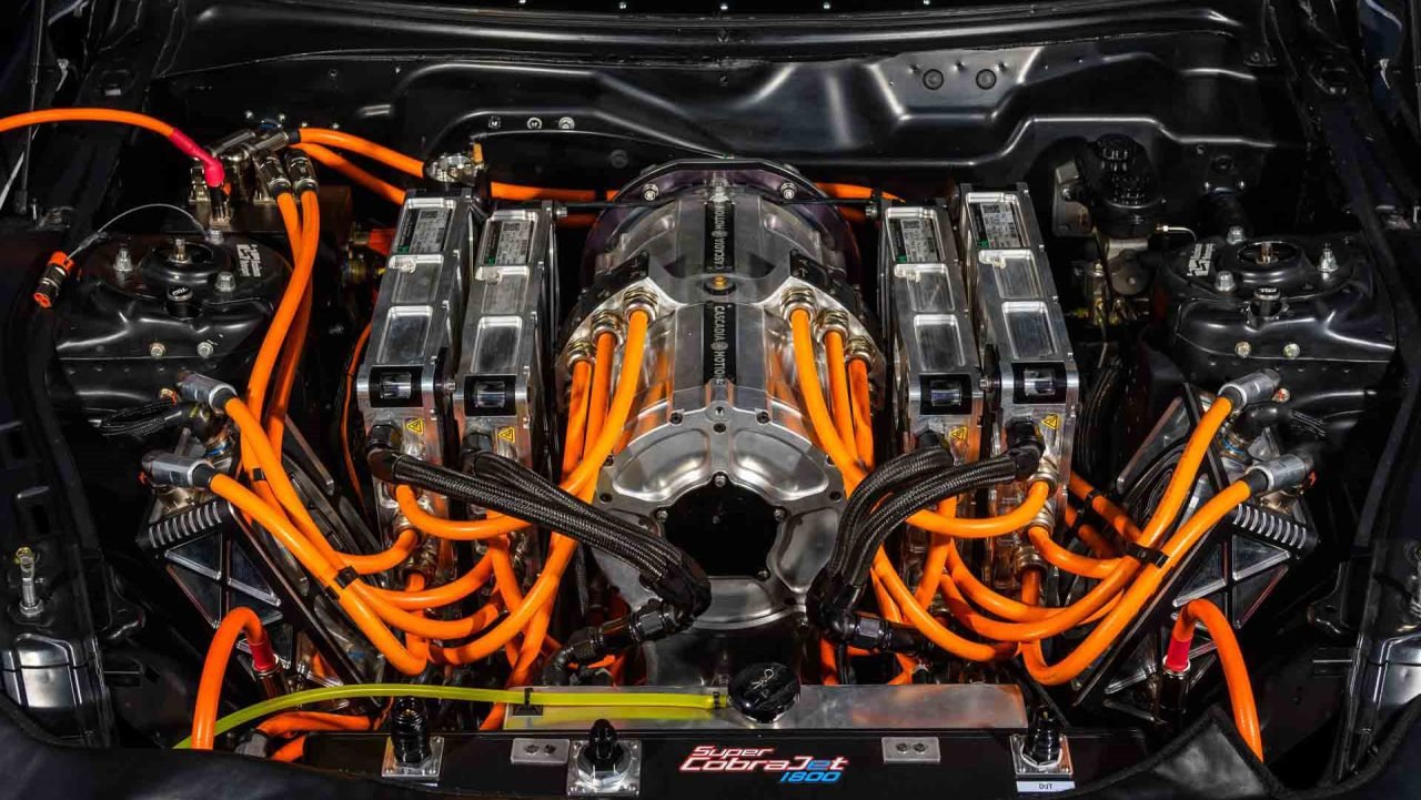 Ford hasn’t said if there’s any extra power, but the automaker confirmed a new transmission and a redesigned battery that’s lighter than before. Given the power of the Cobra Jet 1400, it’s possible the Super Cobra Jet 1800 has 1,800 hp or more on tap. There’s also a revised rear end featuring improved suspension geometry and larger Mickey Thompson drag radial tires.