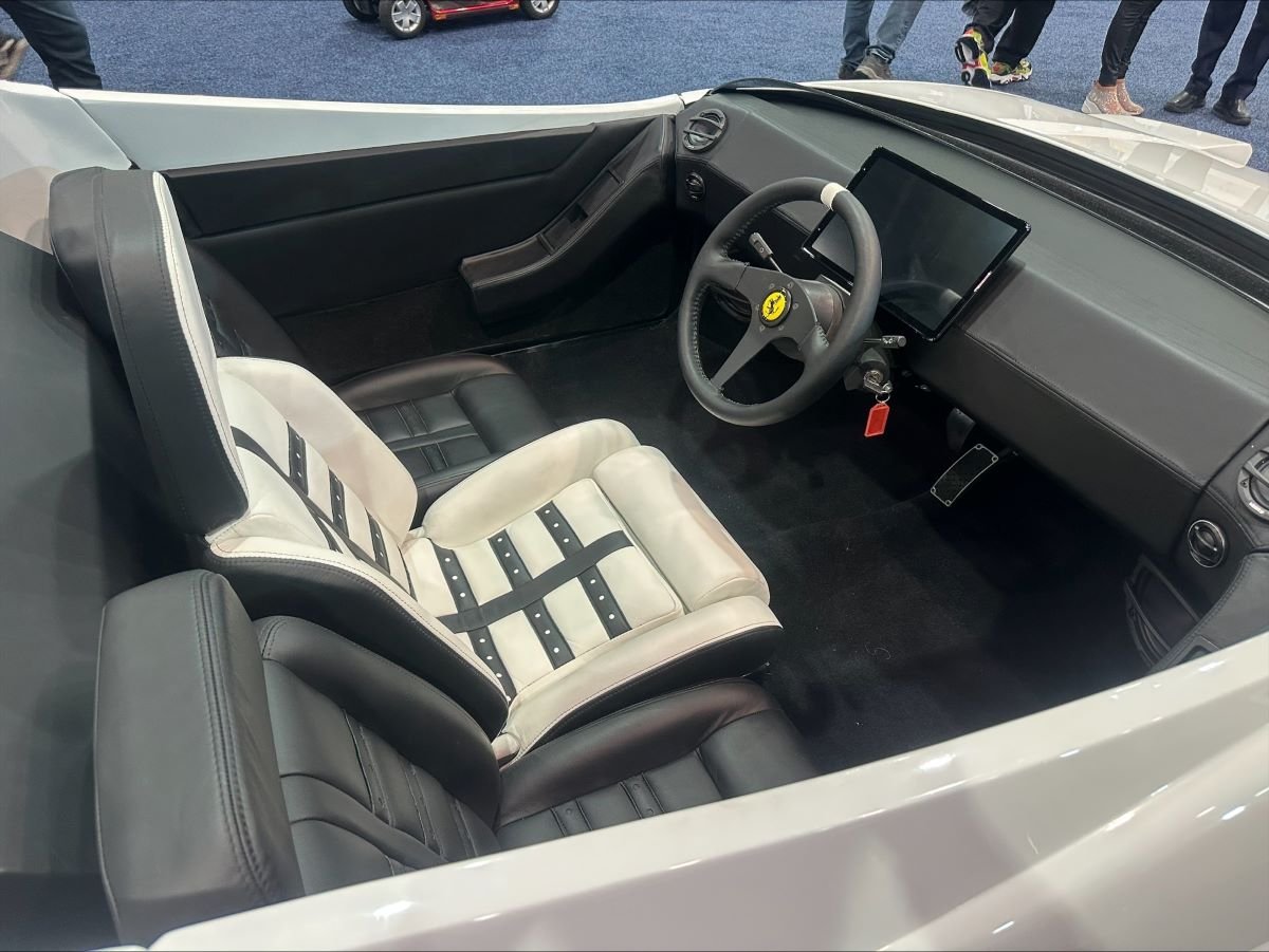 “Changing the game and angering the purists . . . meet the Gas Monkey ‘Testa’,” says the Garage’s announcement. “A Ferrari Testarossa completely reimagined. This striking reinterpretation of the Testarossa boasts a complete custom roadster chop design, center-seat steering, and a complete electric conversion.”