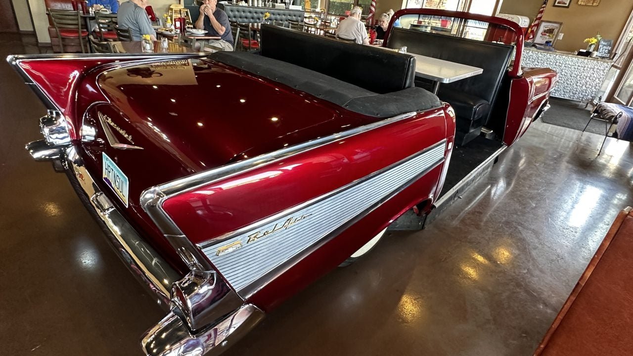 I made the 30-minute trek from Phoenix recently to experience it for myself. The café is part of a nondescript modern-looking business park, so from the outside you’d never know about the special interior décor. The Bel Air is stunning in its candy-like deep red finish, and the body is complete with all its chrome and anodized gold badging. In place of the interior is a four-person booth.