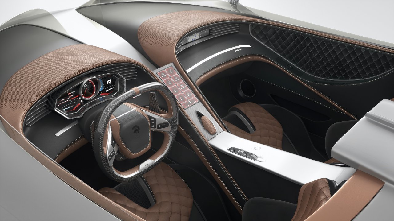 “In the absence of the windscreen, the sinuous carbon-fiber bodywork takes on a life of its own as it flows into the cockpit area, dividing and cocooning its passengers in the bespoke hand-crafted interior. Richly finished