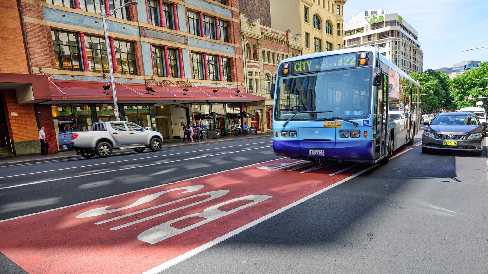 In New South Wales, a bus lane (identified with a red B and an image of a bus) may only be used by a registered bus, taxi (not private ride-share cars), hire-car using HC plates or emergency vehicle. Motorcyclists and bicycles can also use bus lanes.