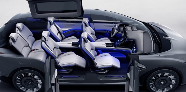 The seats will all be power operated and able to slide into different configurations, the exterior doors also being electrically operated and without door handles; unlocking will be done with either an app or face recognition.