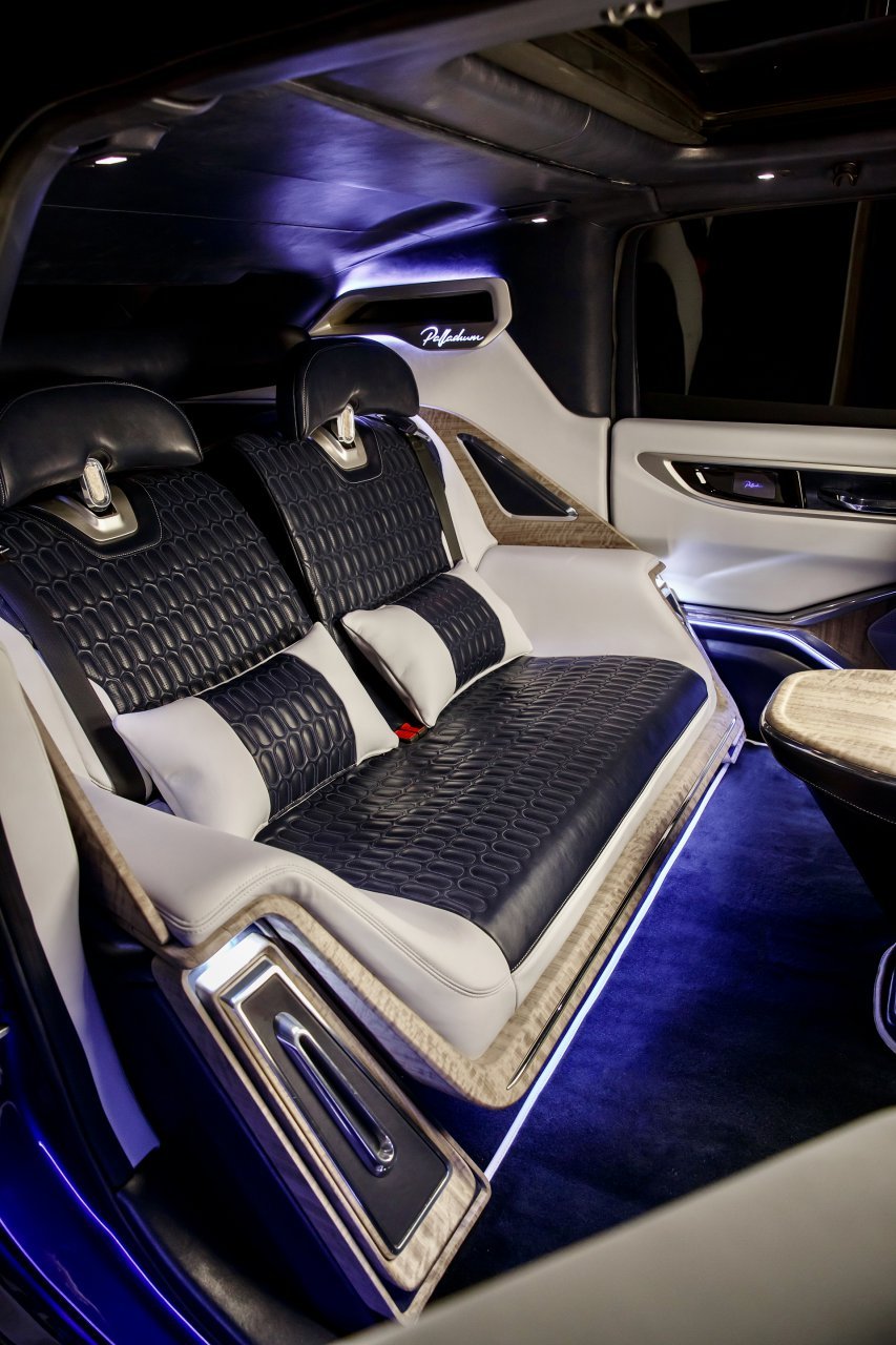Palladium the vehicle is limo sized, nearly 19 feet in length and more than 6½ feet in height. The vehicle offers 4-wheel drive and a 5.7-liter bi-turbo V8 engine providing more than 700 horsepower and 700 pound-feet of torque.
