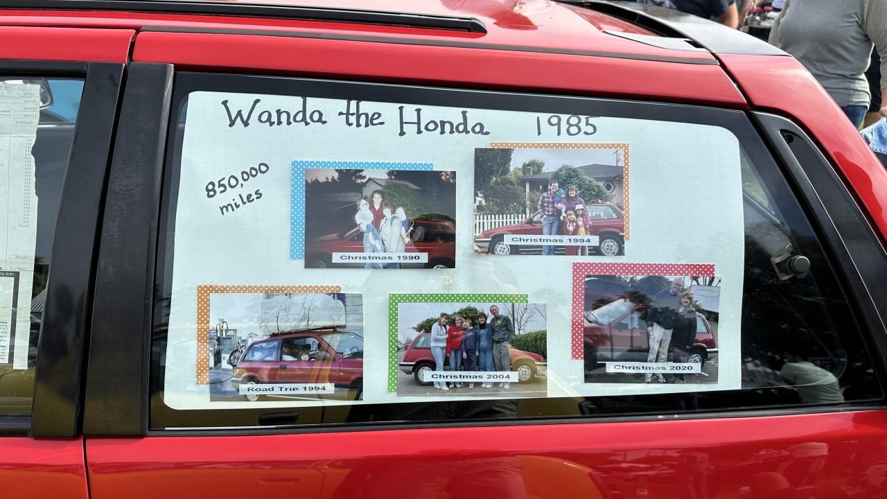 The awards ceremony kicked off around 3:00 p.m., and trophies were distributed in categories according to class. The “Survivor” award was handed to a 1985 Honda Civic 1500 S named Wanda. She is owned by David and Kathy from Visalia, California and has accrued 860,147 diligent miles over the past nearly 40 years. David’s fastidious recordkeeping included a notebook of handwritten maintenance notes. Wanda received a recent paint job and some upholstery refurbishment, but her engine is original.