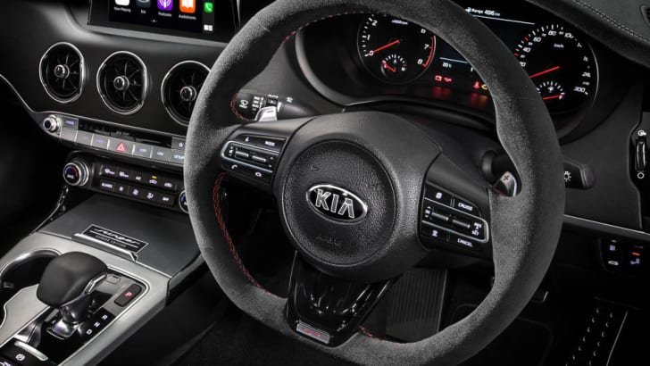 Inside, the steering wheel is trimmed in Alcantara but there’s no extra carbon-fibre. Kia does offer a carbon-look finish for the transmission tunnel on the regular model, should buyers want to keep the theme rolling.