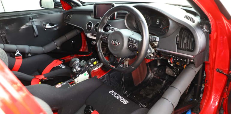 Kia has also turfed the engine cover, parking sensors, dampers for the boot and bonnet, and the rear bumper beam. The rear windows are now glued into place, and lightweight door cards have been fitted – even the sunroof is gone, replaced with a welded steel panel.