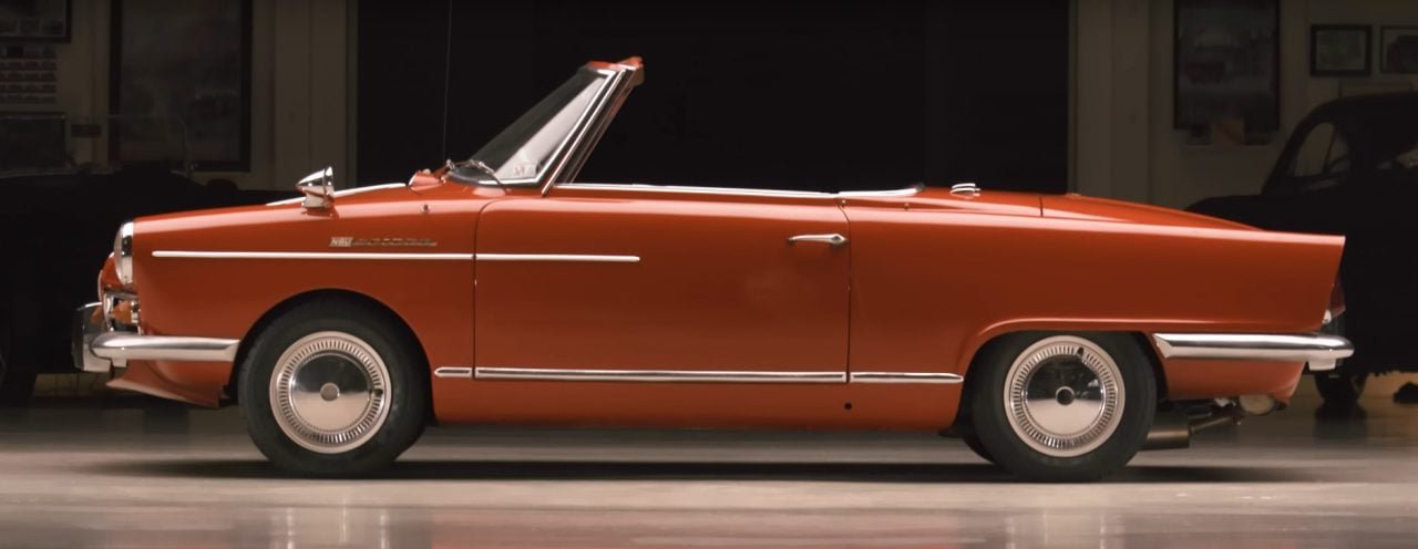 But, for all the variety in Jay’s collection, few Americans will be familiar with the NSU that’s on the below video. A German manufacturer that was once the world’s largest manufacturer of motorcycles, NSU has the distinction of building the first production automobile powered by the Wankel rotary engine: the 1964-67 Spider. Designed by Bertone, the NSU Spider was a convertible of the more conventionally powered NSU Sport Prinz coupe. The single-rotor Wankel measured 996cc and offered between 50-54 horsepower depending on when it was built. However, for all its clever packaging and new-fangled engineering, the Wankel experienced teething problems and fought a reputation for unreliability.