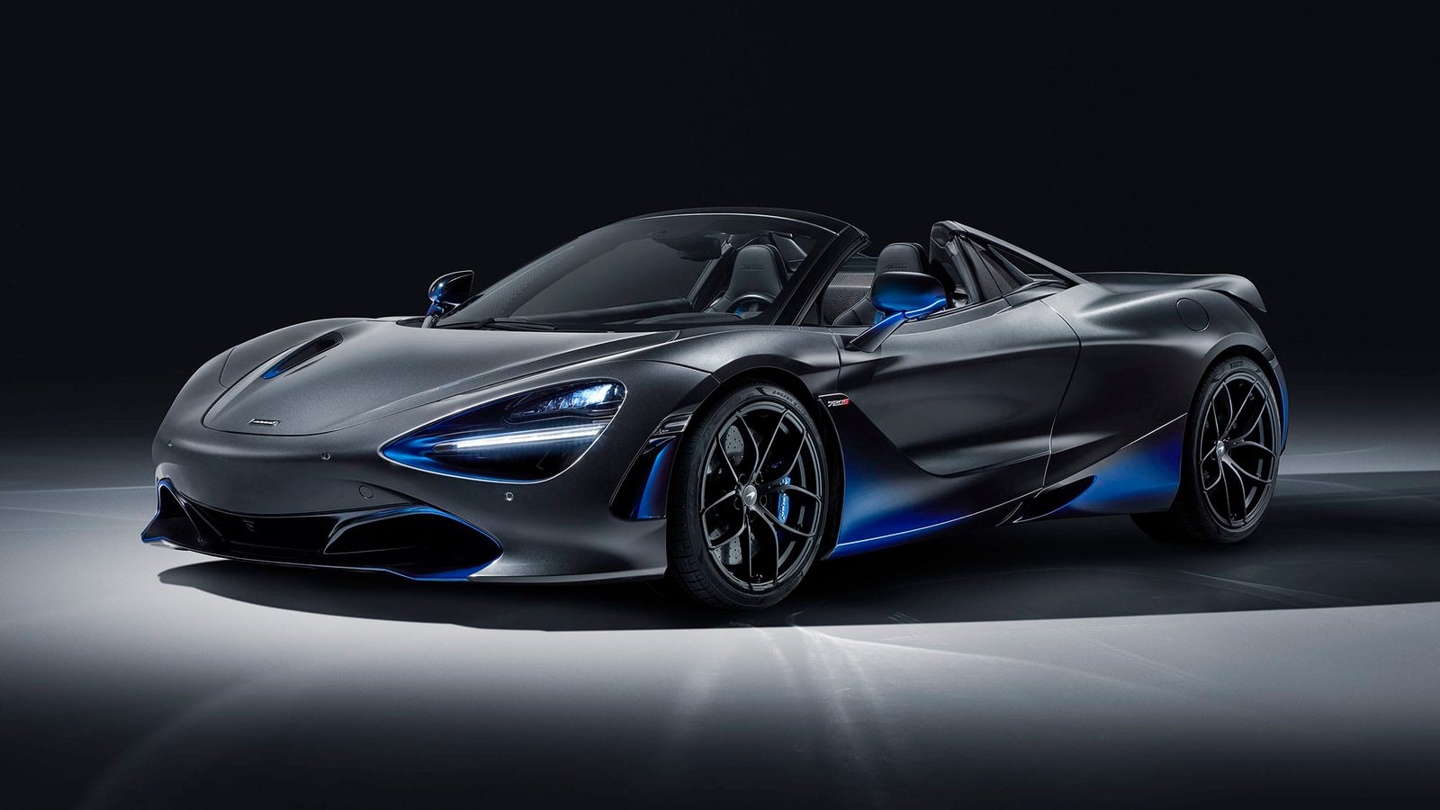 Finished in a main coat of Meteorite Grey, the 720S Spider by MSO features accents that use a tri-tone paint, dubbed Coriolis, in the aero work – Cerulean Blue, Burton Blue and Abyss Black.
