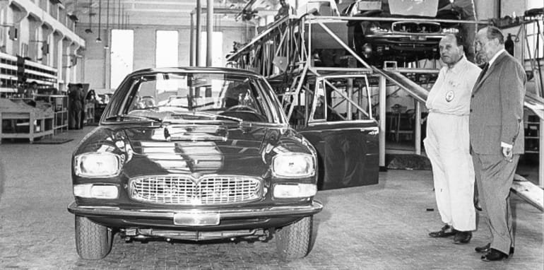 Above: Adolfo Orsi and Guerino Bertocchi inspect a Maserati as it rolls off the Modena assembly line