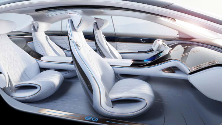 The floor of the cabin is impressively flat thanks to the positioning of the EQ’s battery pack, though the interior would be even more visually spacious if it lost the giant console. Here’s hoping there’s at least some cupholders and storage nooks in that beast, though it’s hard to imagine the production model not also coming in a five-seater version.