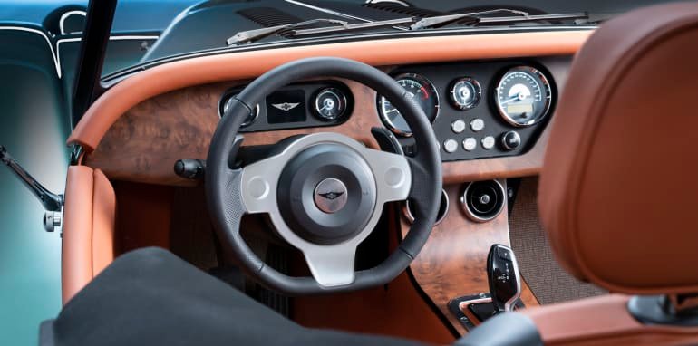 Behind the wheel, the Plus Six has been completely redesigned. The centre console is trimmed in beautiful walnut, with art-deco dials and a minimalist steering wheel. The gear lever and paddles, though? They’re direct from the BMW Z4.